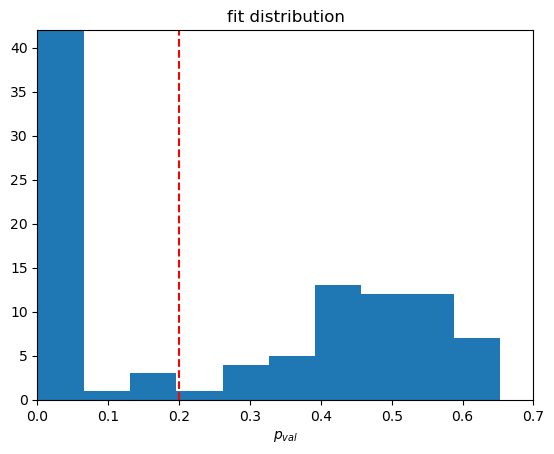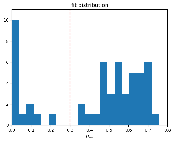 We can again study the statistical quantities of our fit results with the same tools as the baseline fits and find based on the histogram that a p value of 0.3 is a good cutoff.
